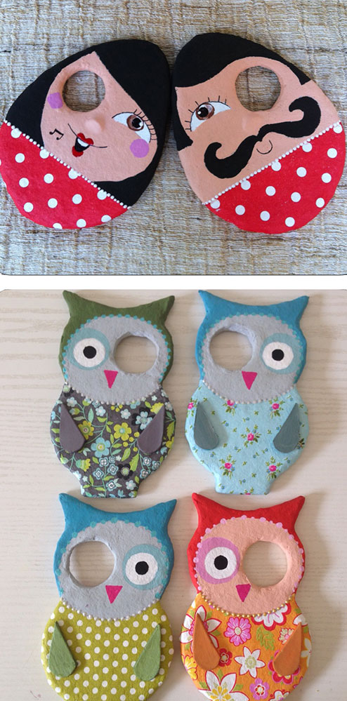 Creates and sculpts items from papier maché and acrylic paint. They are handmade with lots of love. The works are characterized by their colorfulness and originality, and are full of joy. My products include: funny magnets faces, a selection of colored salt and pepper shakers that cling together, stands for toilet paper, door eye holes, boxes and pins for clothing.