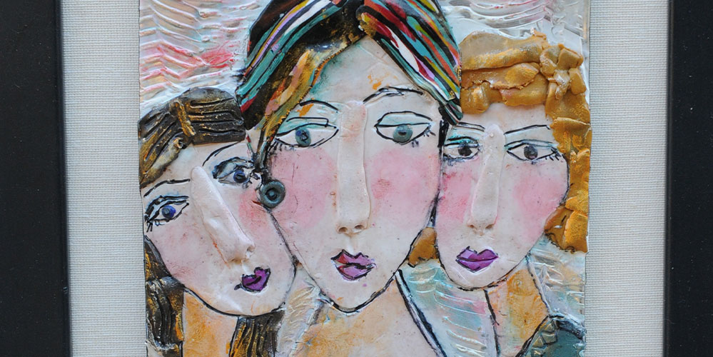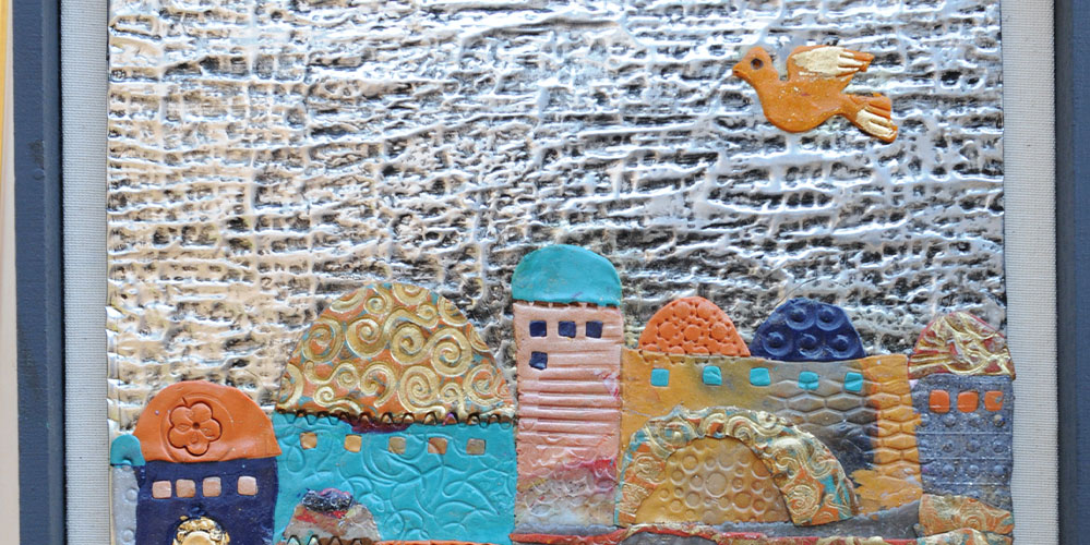 Nurit creates colorful FIMO air dry clay pictures of Eretz Yisrael – Jerusalem, Tel Aviv and more … In the works, Nurit combines gold leaf with the FIMO. All the works are framed.