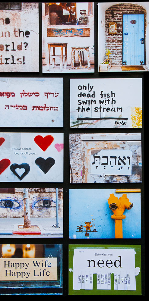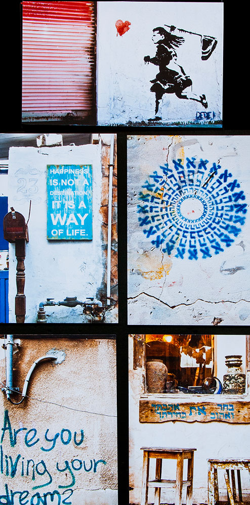 I present street photography that include photos of openings doors, windows, gates and street art In general. My husband and I regularly walk through the hidden corners of the streets of Tel Aviv and Jerusalem and document the temporary street art that reflects the present. The graffiti phrases evoke excitement or identification in the eyes of the beholder and are presented in original frameworks.