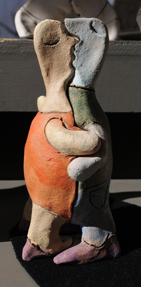 MATCHING. Our sculptures are about love, embracing, dancing, with the intention of increasing the love in the world and bringing the blessing of love. The small ceramic Sculptures are all feature couples hugging or kissing, and can serve as a boxes, serving dishes, as an Ethiopian box, or stand open or closed on the shelf, sending out the energy of love.