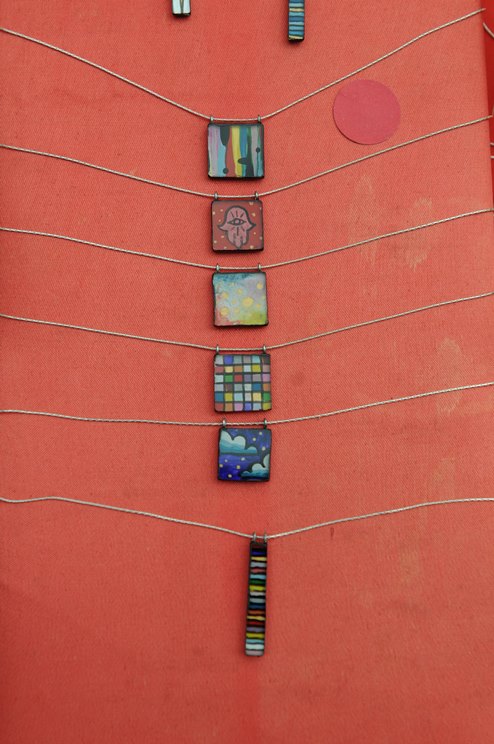 תכשיטים המשלבים ציור מיניאטורי על זכוכית בטכניקה מקורית וייחודית. ציור בסגנון אורבני – גיאומטרי מגוון של עגילים, טבעות ותליונים.