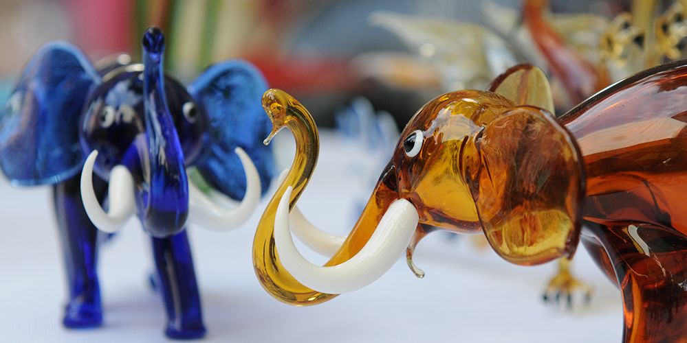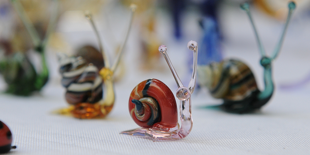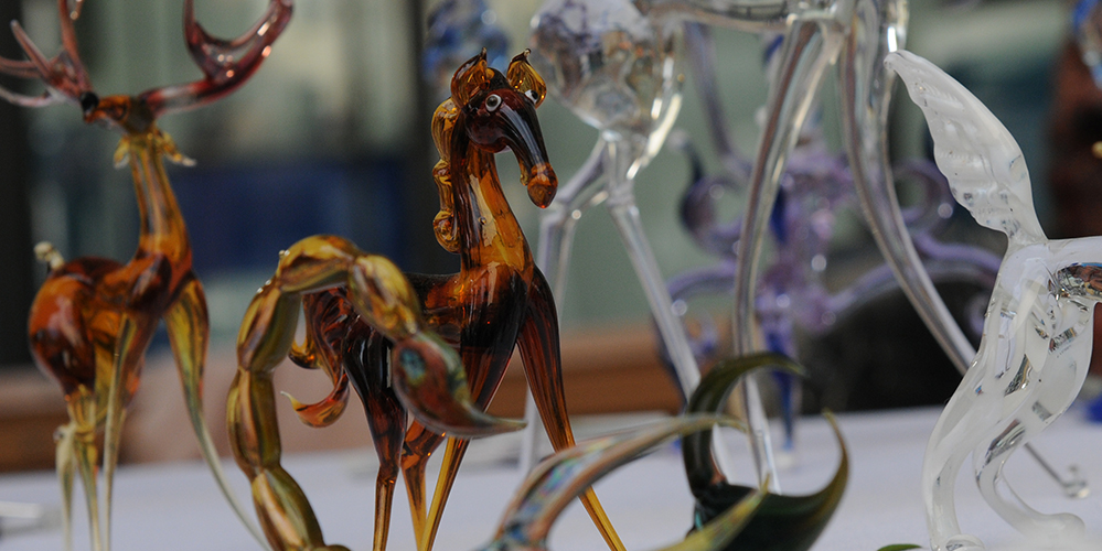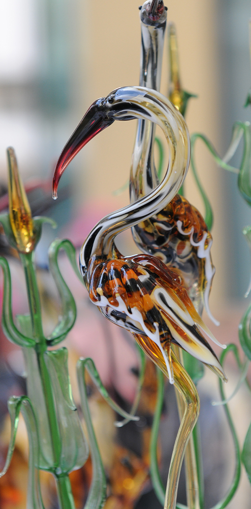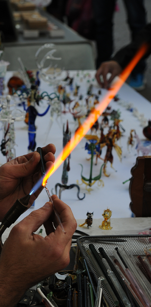 נפח זכוכית וירטואז היוצר בדוכן פסלי זכוכית צבעוניים ומורכבים לעיני הקהל הצופה. ניתן להזמין במקום ולצפות ביצירת הפריט בלייב.