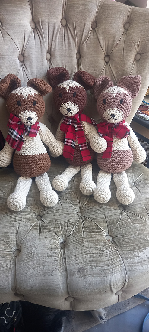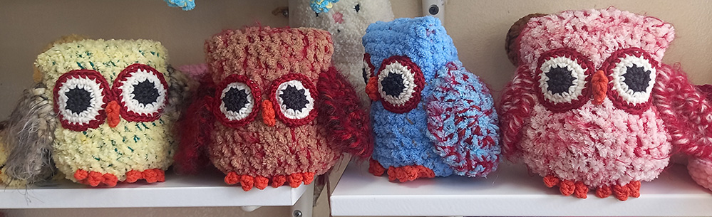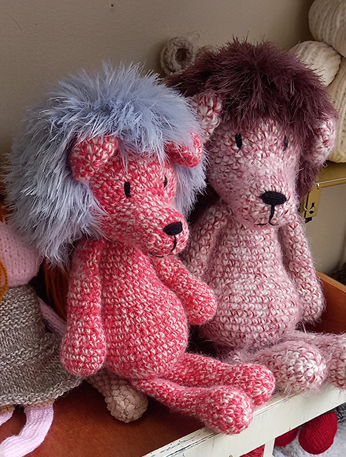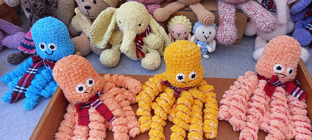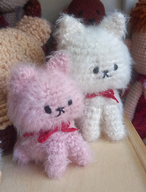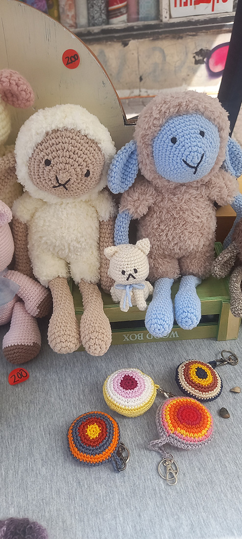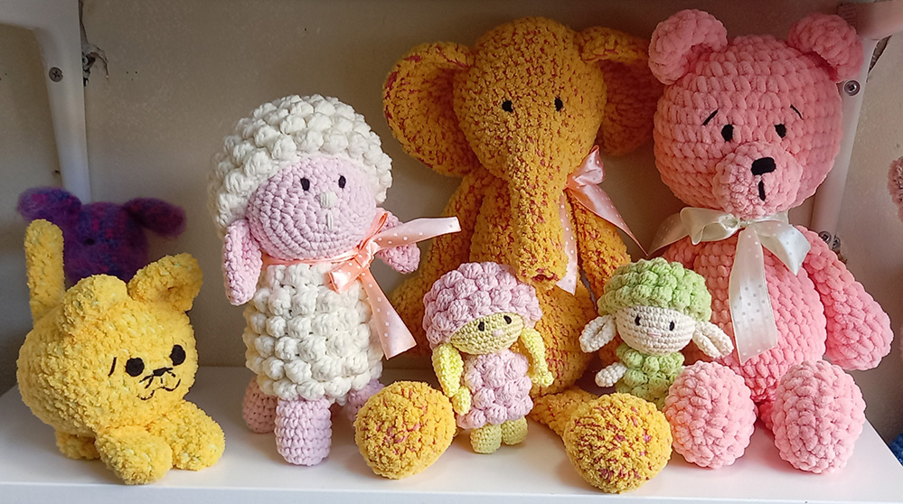 אני יוצרת בובות בסריגה בטכניקת קרושה ומסרגות בחוטי כותנה וצמר. אוהבת במיוחד לשחק עם הטקסטורות וליצור חיות שעירות כמו חתולים, כלבים, ארנבים, ג’ירפות, פילים, קיפודים, צבים, תמנונים ועוד ועוד…