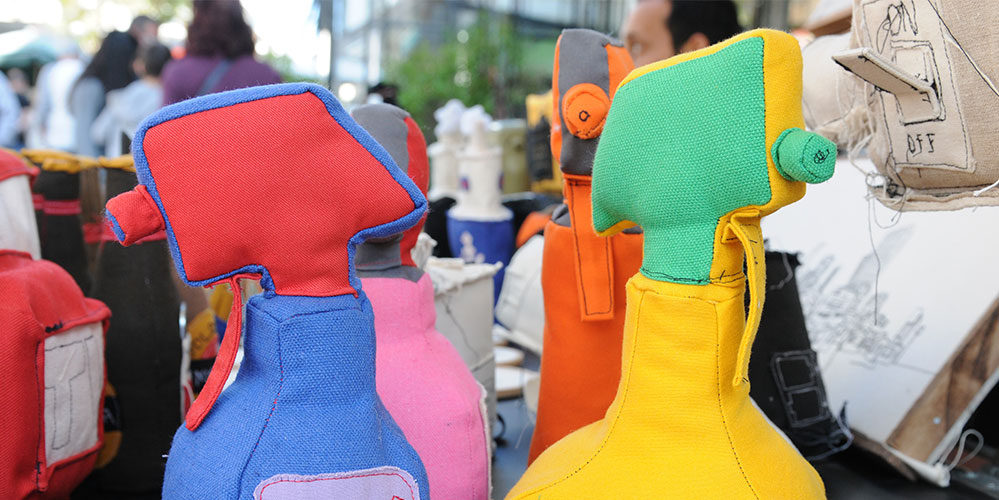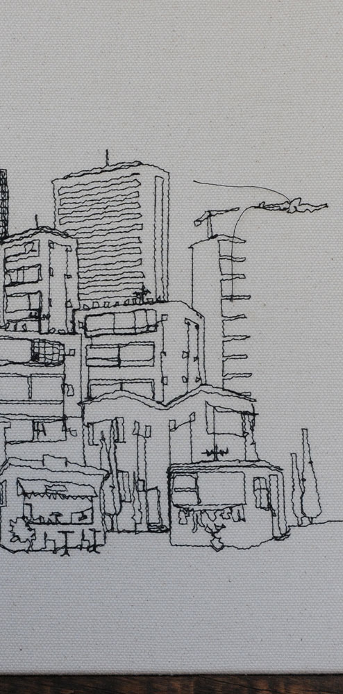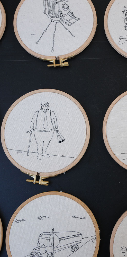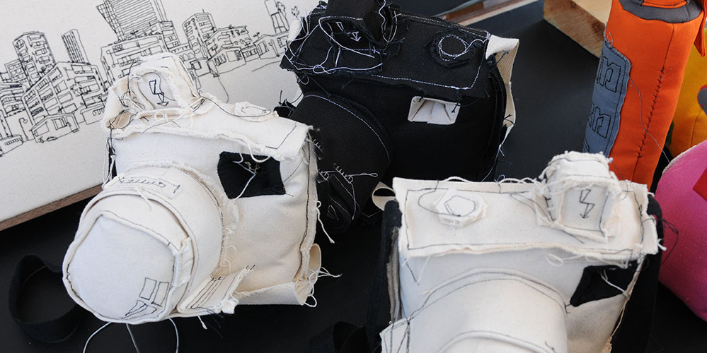 I sit with my sewing machine at my sewing stand and sew my work on the spot. I create interesting textile works showing Tel Aviv scenes by drawing in black thread on canvas: wallets, cases, and cloth bags, decorated with sown embroidery or patterns. I create sculptures made from canvas of ships, planes, a bottle of beer, a bowling set, all made of cloth. Soft works that are designed with humor and delicacy.