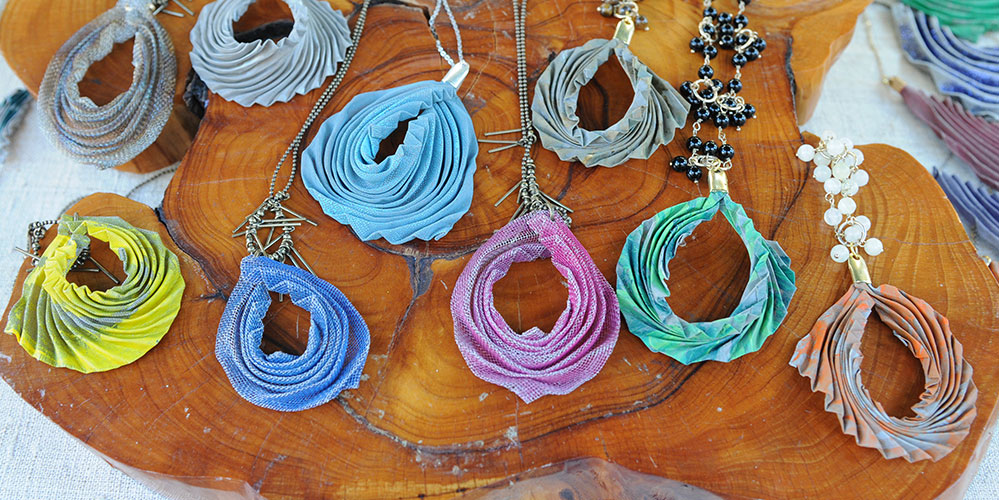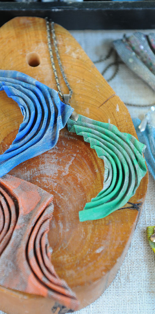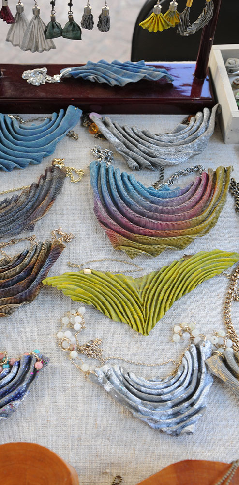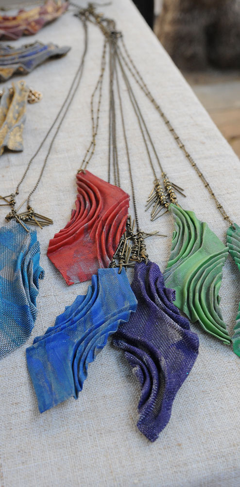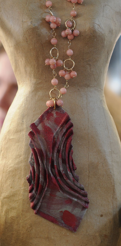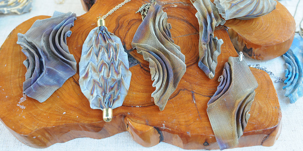 .Jewelry made from thin stainless steel mesh. The manufacturers of the thin stainless steel mesh, usually used to filters or fine powders, did not imagine how the artist Shoshana Danieli would use it to create her jewelry design. Shoshana cuts, folds, and crumples the mesh as she wishes until they become beautiful and light jewelry reminiscent of dream fans, airy bells, or ball gowns. The jewelry is dramatic, interesting, and lightweight.